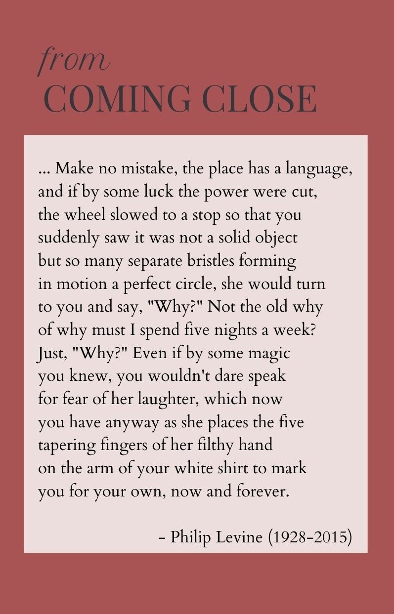 The single poem I have used most often is Philip Levine’s “Coming Close,” from What Work Is, 1991. The short poem’s portrait of a woman who works a factory job, polishing brass tubes, gets things just right—it gets an incident of identity and empathy and dignity just right. I use “Coming Close” to ask students questions about their academic plans, as such plans promise (or not) social mobility and economic entitlement. The poem has an immediate way of placing its dirty hands on the clean sleeves of my students.